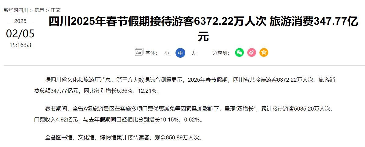 如果要评选2025年春节旅游市场最大的“黑马”,那非四川莫属,6370万的游客接待量,排名第二,同比增长近58%,这个成绩足以让所有人大跌眼镜。