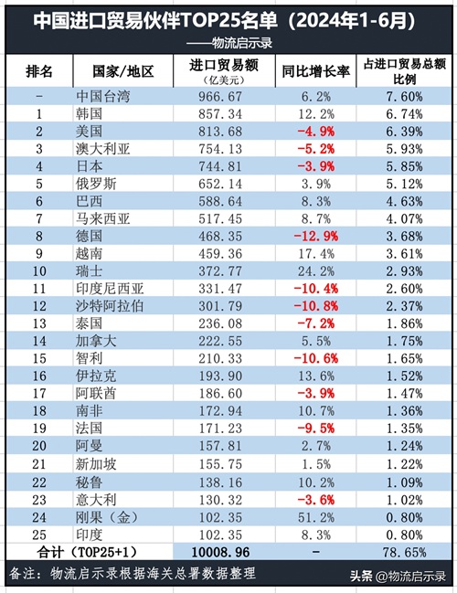 三、2024年上半年我国进口贸易伙伴TOP25+1名单