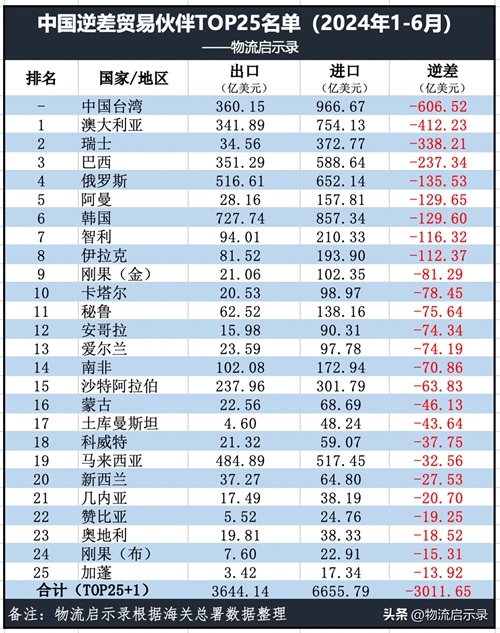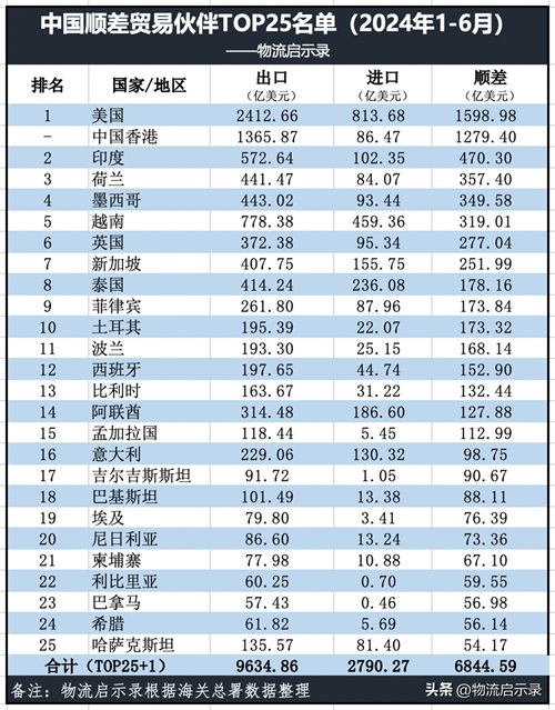 2024年上半年我国贸易伙伴TOP25排名、顺差和逆差TOP25排名