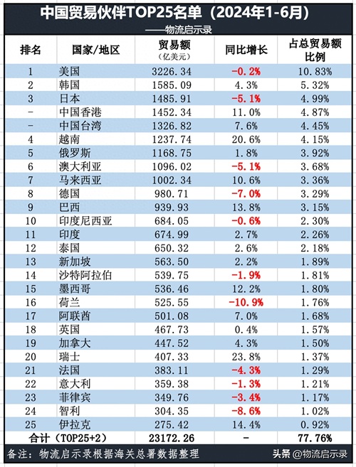 一、2024年上半年我国贸易伙伴TOP25+2名单