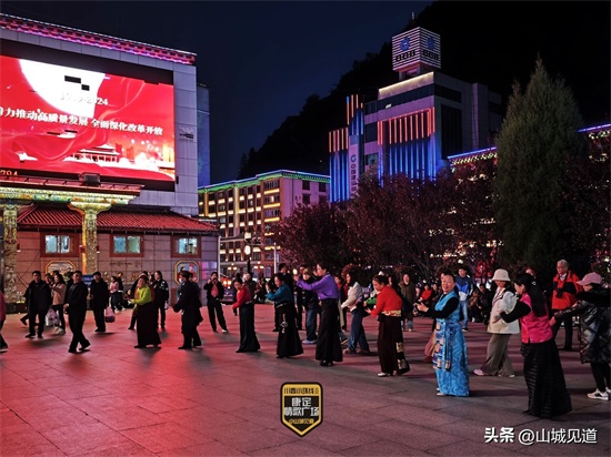 离开溜溜城,步行几分钟来到情歌广场。华灯初上,广场上矗立着大型音乐喷泉和《康定情歌》主题雕塑,周围的建筑也被灯光装点得格外美丽。此时,广场上聚集了许多当地居民和游客,有人在跳锅庄舞,欢快的节奏让人忍不住加入其中,感受康定人民的热情与活力,享受着这惬意的时光。