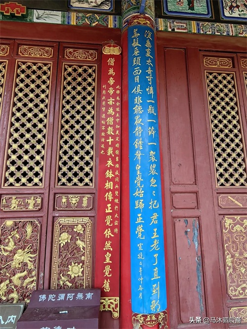 红底金字联,把建文帝与四叔朱棣的格局做对比。蓝底金字联,把建文帝芒鞋徒步,艰辛辗转,逃亡云南,落脚狮子山正续寺,皈依佛教,几十年来静心修炼,照应了祖父曾经在皇觉寺出家一事,如今孙子又在正觉寺[为了呼应“皇觉寺”,把“正续寺”写成“正觉寺”]出家,似是冥冥之中上天有安排——
