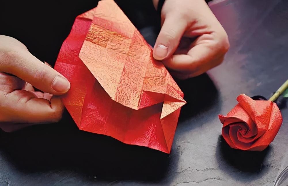 用一张红纸徒手就折出一朵玫瑰花时的他