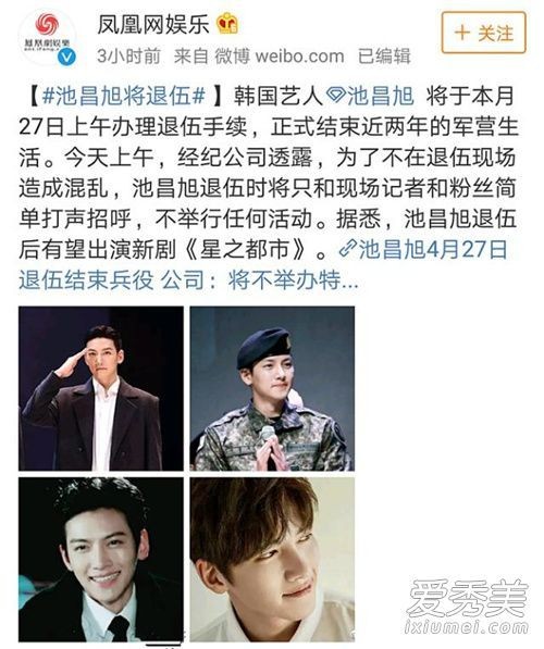 韩国演员池昌旭终于低调退伍,为了避免大量粉丝聚集造成混乱,池昌旭并没有举办粉丝见面会。不过他还是向到江原道迎接他的粉丝还有媒体表达了自己的感谢之情,并发表了简短的退伍感言!当天有近百名粉丝远道而来为退伍的池昌旭应援,池昌旭的好友也亲自迎接他回家!入伍近两年的池昌旭如今变得更加强壮和成熟,颜值依旧超高。