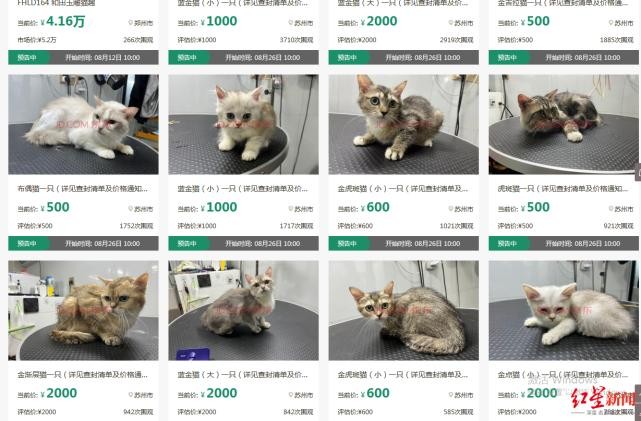 至于此次宠物猫的拍卖价格,法院在8月2日出示给当事人的通知称,经法院询价,确定各商品宠物猫的财产处置参考价(首次拍卖保留价)为:虎斑猫500元/只,布偶猫500元/只,金吉拉500元/只,金渐层2000元/只,蓝金(大)2000元/只,蓝金(小)1000 元/只,金点(小)2000 元/只,金虎斑(小)600 元/只。若流拍后再次拍卖或变卖,则按上述首次拍卖保留价的80%确定拍卖或变卖保留价。