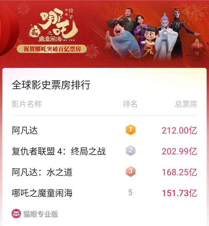票房狂飙:从“国漫之光”到“全球屠榜五”冲全球票房榜四:现在已破151.73亿票房