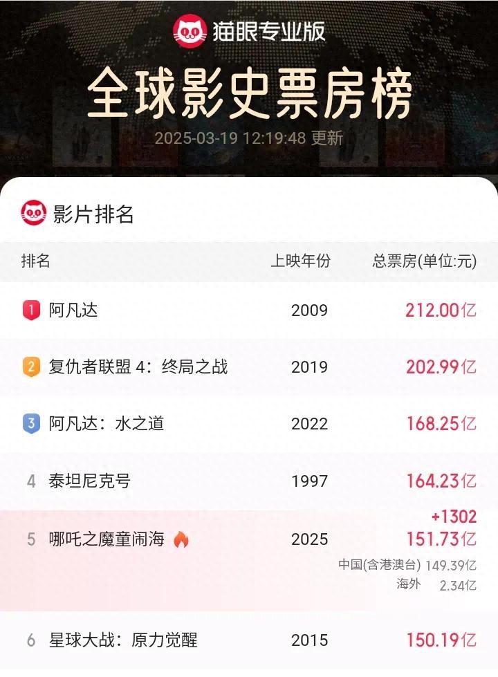 截至2025年3月19日,下午12:26《哪吒之魔童闹海》(下称《哪吒2》)全球总票房已突破 151.73亿 ,强势跻身全球影史票房榜 第五位,成为首部冲入该榜单前十的亚洲动画电影。这一成绩不仅刷新国产电影天花板,更以日均 2.1亿 的吸金速度,让好莱坞巨头直呼“东方神话不可小觑”!国漫崛起了,