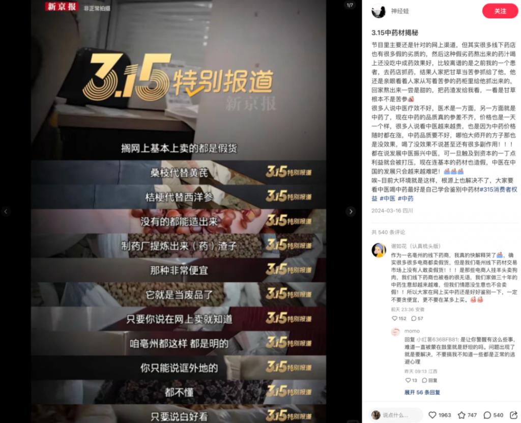 315 刚曝光完,不法分子用外形相似的药材冒充、废药渣二次加工、还有染色和硫磺熏蒸等各种科技狠活。