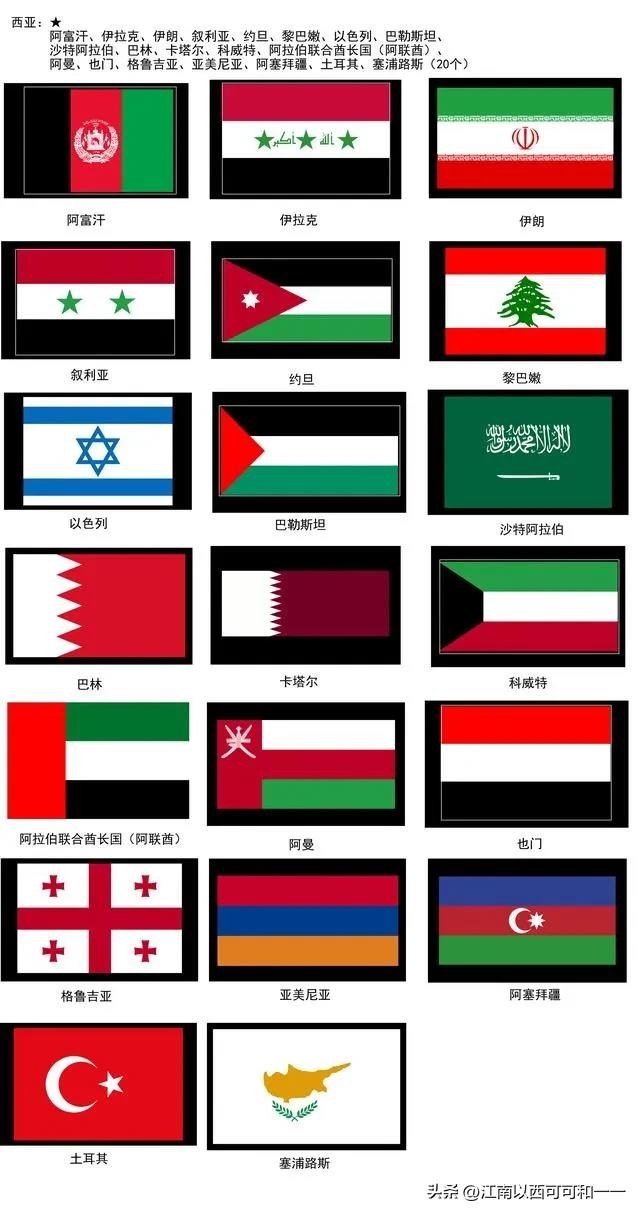 西亚国家:巴林、埃及、伊朗、伊拉克、以色列、约旦、科威特、黎巴嫩、阿曼、卡塔尔、沙特阿拉伯、叙利亚、阿联酋、也门、巴勒斯坦。