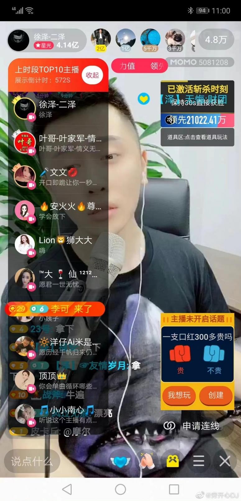那段时间也是徐国豪的巅峰时刻。2019年一份陌陌主播收入榜单显示,徐泽曾以单周224万元收入拿下全平台主播收入第一。