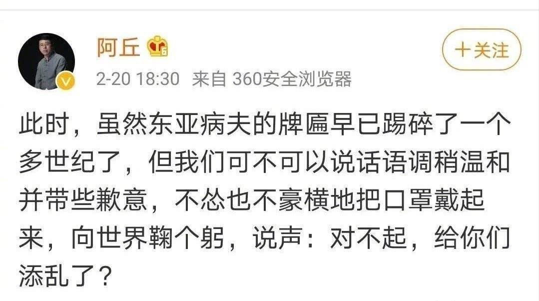 疫情爆发以来,全国上下万众一心,积极应对疫情防控,然而阿丘却在微博上大放厥词,不仅提到了“东亚病夫”等敏感字眼,还号召大家向世界鞠躬道歉,且不说彼时疫情起源并未查清,光是这种居高临下的态度就引起了不少人的反感。