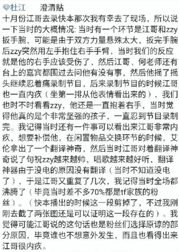 眼看着舆论越闹越大,杜江只好发文表示掰断手腕的是自己的高中同学,就连张真源的公司也出面替他解释,表示张真源只是韧带拉伤,而当时录制时也只是手腕轻微不适。