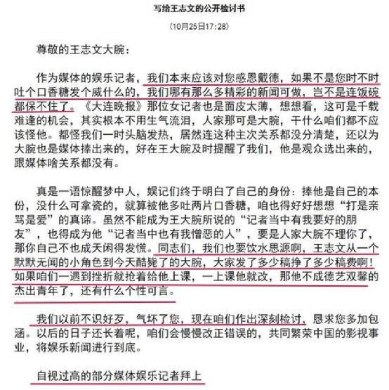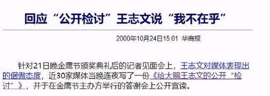 彼时30家媒体连夜写了一份“给大腕王志文的公开检讨书”,并在答谢会上当众宣读,通篇都在用反讽的语气指责王志文不懂感恩、耍大牌。