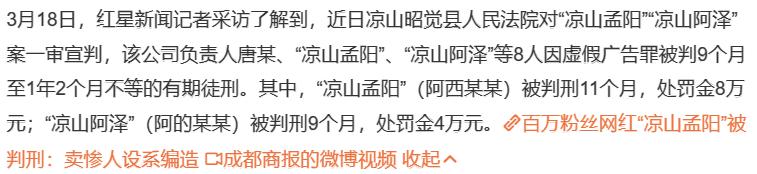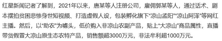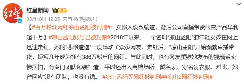 据了解,原来网红凉山孟阳靠造假卖惨人设,引流后通过直播带货牟利超过千万。