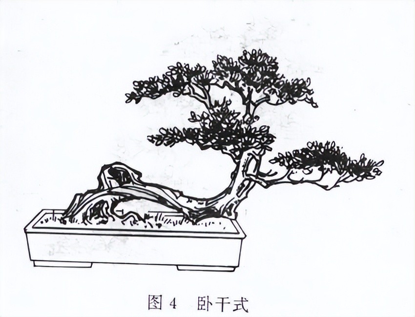 卧干式指的是植株横卧在土面上的盆景 ,都是弯弯绕绕生长的 。 卧干式植株它们的主干都很粗壮 ,主干上长有很多细小的分枝 。