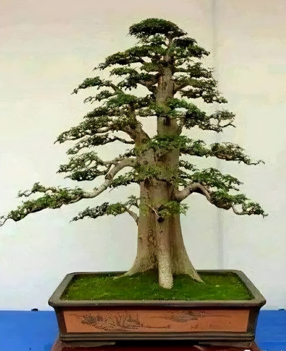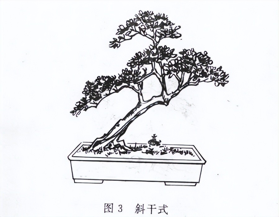 要想养斜干式盆景, 可以在种植时选择具有这种形态的植株, 也可以将直干式植株倾斜种植,再慢慢培育根部和树冠造型 。