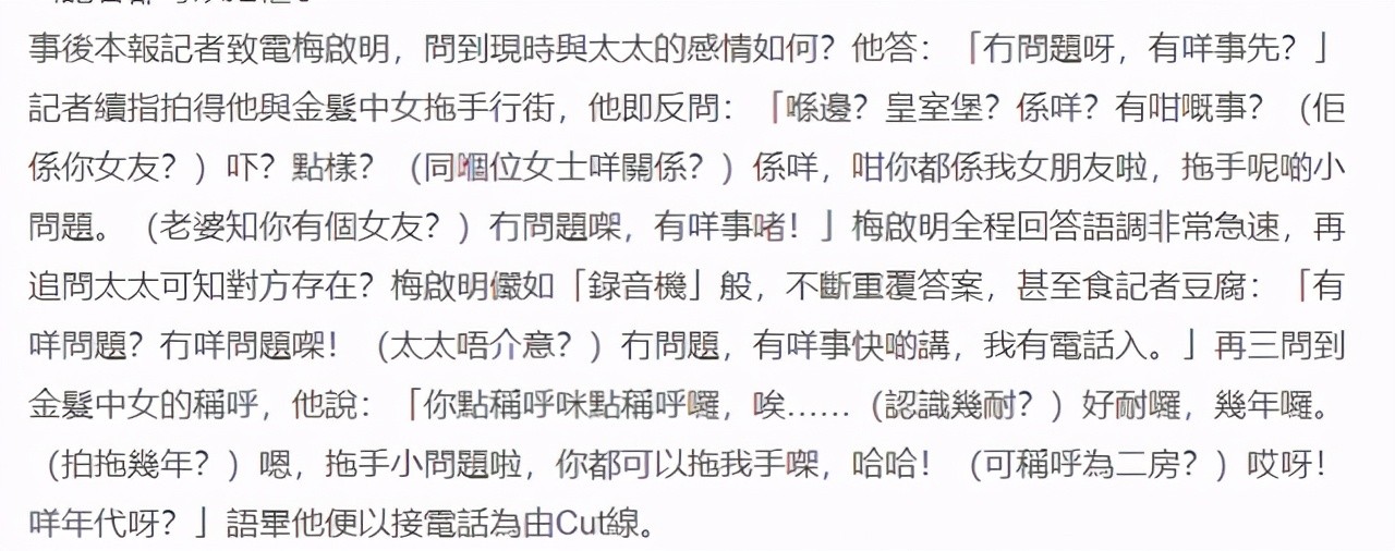近日,港媒拍到梅启明与一名中年女子牵手逛街,梅启明直认对方是“女友”,更表示自己与太太感情也稳定,这是享受齐人之福呀,公开出轨呀!