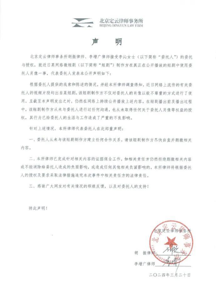 3 月 20 日,就某短剧把李沁证件照 P 成黑白一事,李沁工作室发布声明:在短剧播出前及播出过程中,该短剧制作方从未与委托人进行过任何沟通,也从未取得任何关于委托人肖像等权益的授权,其行为已给委托人的生活与工作造成了严重的不良影响。针对上述情况,本所律师代表委托人在此郑重声明: