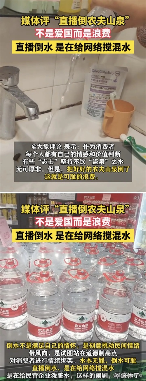 随后网上出现跟风倾倒农夫山泉视频,也有博主直播倒水。