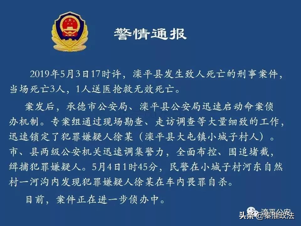 案发后,滦平警方通过微信公众号“滦平公安”发布警情通报,5月3日发生在滦平的致4人死亡刑事案件的犯罪嫌疑人徐某,已于5月4日1时45分被发现在小城子村河东自然村一河沟内畏罪自杀。