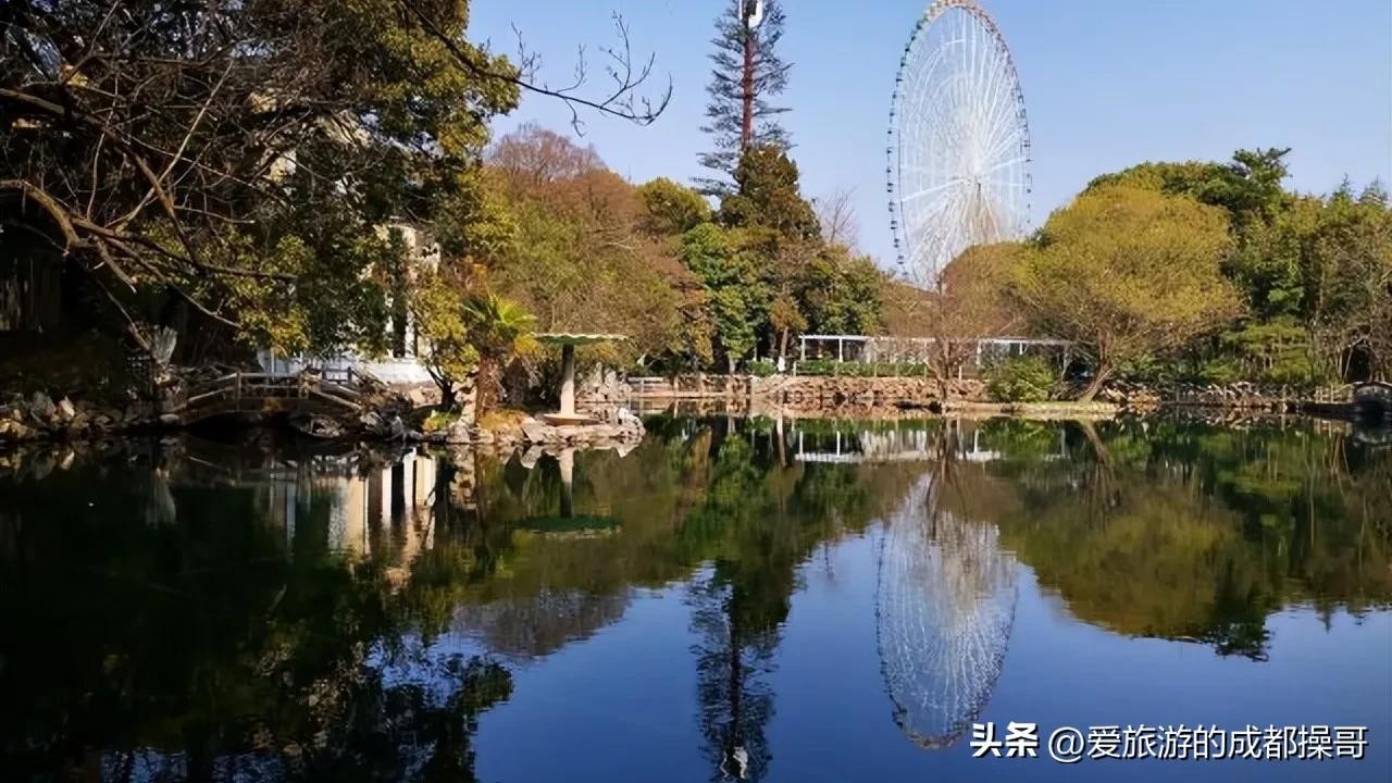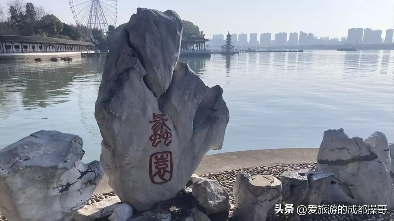 进门后穿过层层曲径后便到内湖的荷花区(这个季节还没有荷花),这里是自然景观的精华区,中心是内湖上环绕着大片荷花的四方形石廊,每边各有一座“四季妙亭”,寓意春、夏、秋、冬,在一座亭中拍对面的两三座“孪生”亭和远方的摩天轮会很有构图美感。