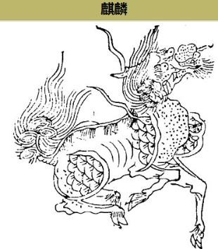 麒麟的首似龙,形比鹿,足如马,尾若牛尾,背上有五彩毛纹,腹部有黄色毛,口能吐火,声音如雷。相传只在太平盛世或世有圣人时才会出现,所以被称为瑞兽。汉许慎《说文解字》:“麒,仁兽也,麋身牛尾一角;麐(麟),牝麒也。”《春秋感精符》:“麟一角,明海内共一主也。王者不剐胎,不剖卵,则出于郊。”;《文选·刘琨<进劝表>》:“一角之兽,连理之木,以为休征者,盖有百数。”