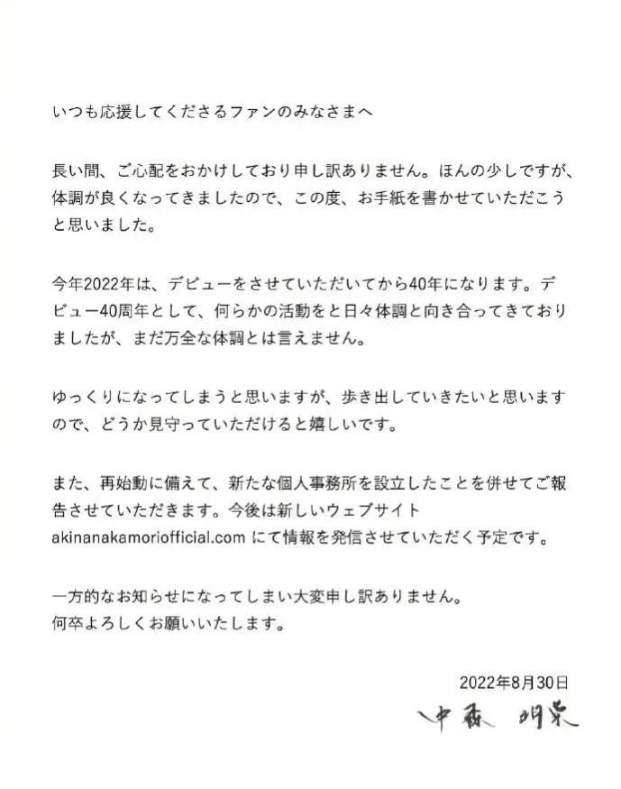 自从2018年,中森明菜突然感觉到身体不适,经过思考后,最终决定暂停演艺活动。