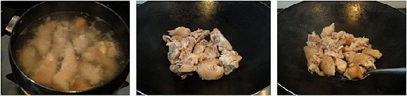 4、锅内不放油,先烘干水,再放猪脚炒干水后盛起备用。继续放入姜片用小火反复炒干水。