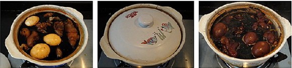 5、另取一砂锅洗净,小火烘干水后,将姜片放入煲内,倒入甜醋煮沸,这时可以试下味,如果觉得偏甜可加少量豉美斋甜醋,偏酸可加少量黄糖,用小火煮半小时,待姜醋煲好后再将猪手、鸡蛋放入内煲慢火1个小时即可。