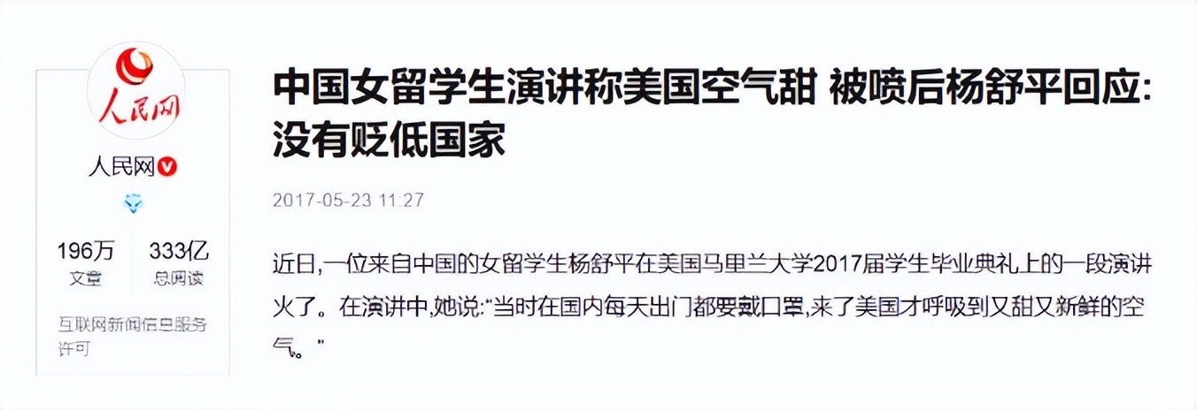人民网——中国女留学生演讲称美国空气甜 被喷后杨舒平回应:没有贬低国家
