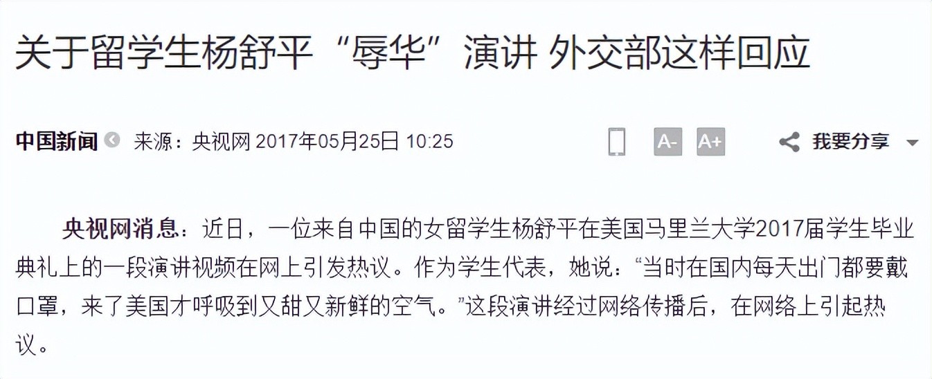 关于留学生杨舒平“辱华”演讲 外交部这样回应——央视网