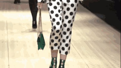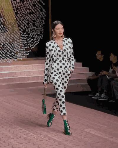 她穿着波点西装,腰线明亮,绿色的鞋子和包包搭配黑白色的波点十分有个性: