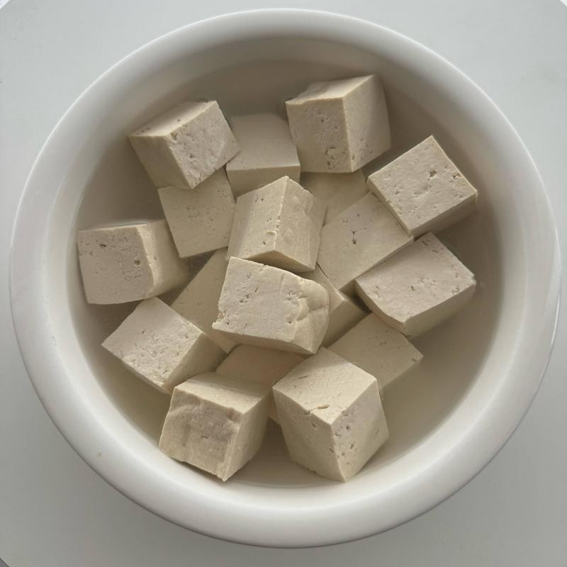 制作之前,请先将豆腐切成大小均匀的小块, 这样能够使豆腐在烘烤时受热均匀,更容易烤出外焦里嫩的口感。可以根据个人喜好选择豆腐的形状,例如小方块、长条状等,之后用厨房纸巾轻轻吸去表面的水分。