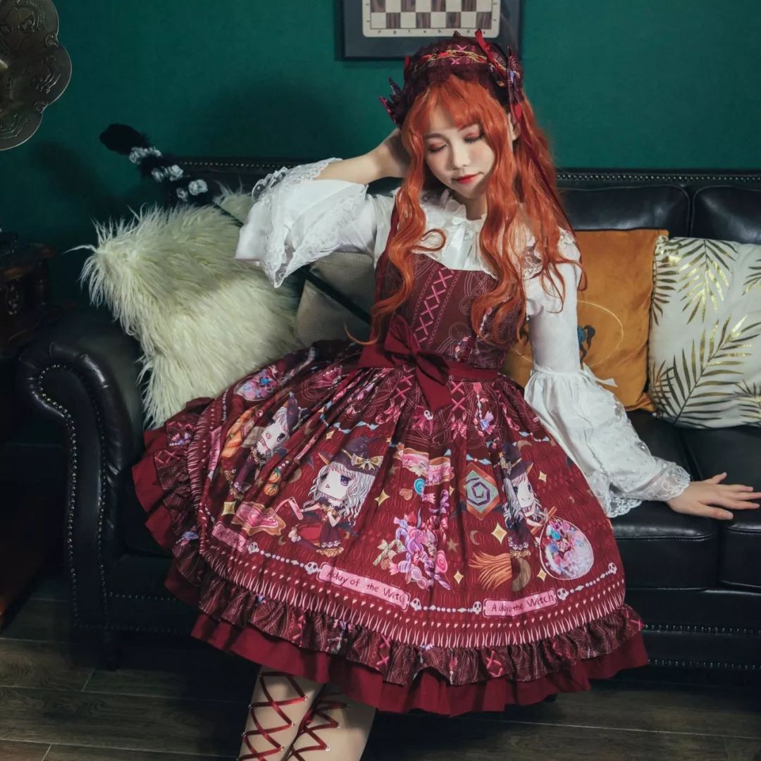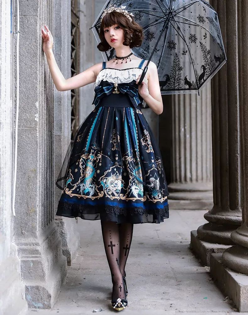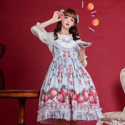 JSK(jumper-skirt):lo装中最常见的款式,类似背带裙,里面要加衬衫。