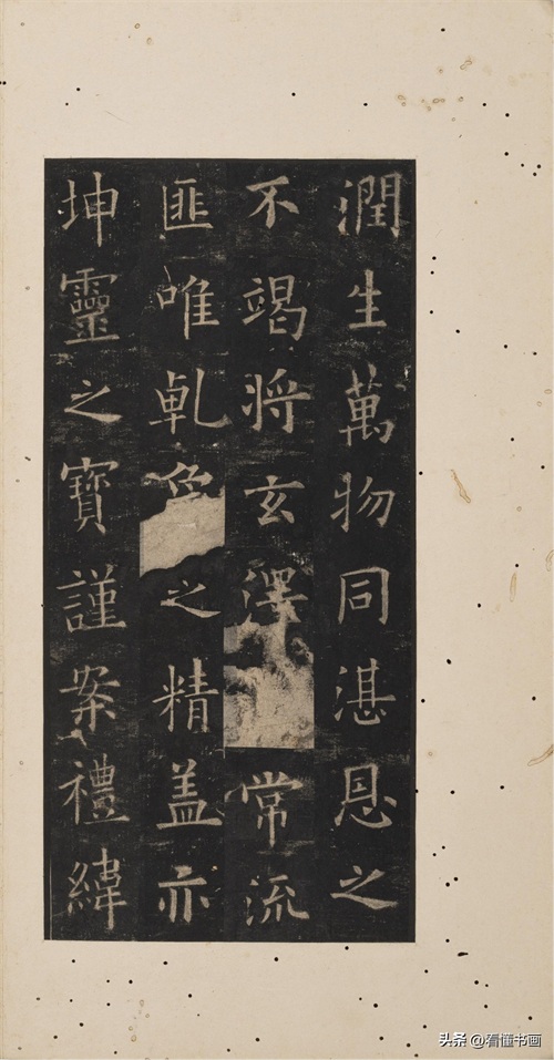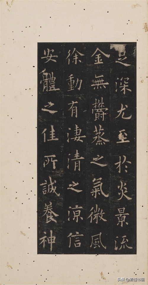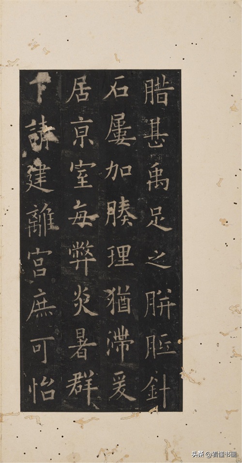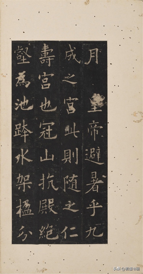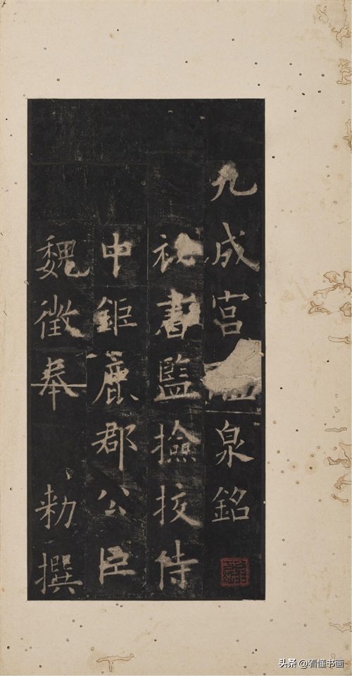 《九成宫醴泉铭》,或称《九成宫碑》,唐贞观六年(632年)立于九成宫内。碑高270厘米,上宽87厘米,下宽93厘米,厚27厘米。碑额刻有六龙缠绕及阳文篆书“九成宫醴泉铭”六字,每字约10厘米。碑有界格,格约3.5厘米(即古之谓“寸楷”),24行,行50字,1109字。