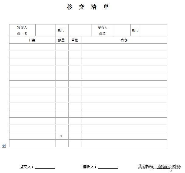 1、移交清单一式四份,移交人、接收人、监交人各执一份,公司档案员存档一份