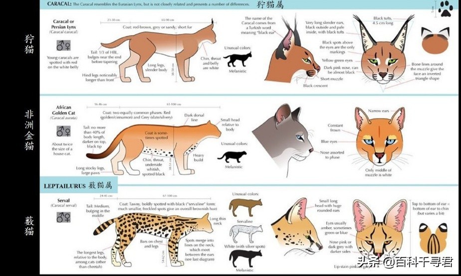 可以看出三者的身材都是大长腿小脑袋,但薮猫的身体更苗条一些,而狞猫的身体更粗壮一些。薮猫被称为“小号的猎豹”,而狞猫就相当于美洲狮。