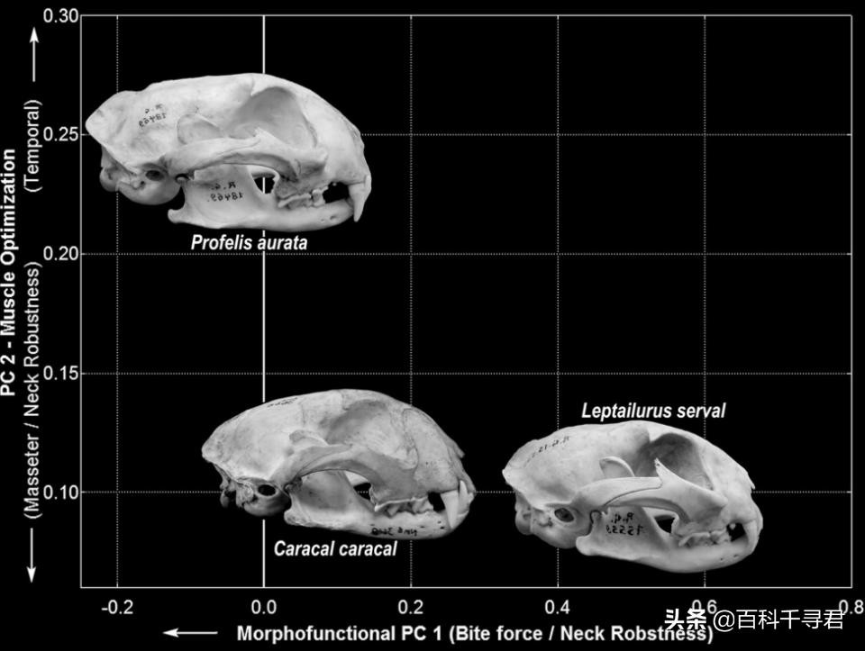上图是原猫、狞猫(Caracal caracal)和薮猫(Leptailurus serval)三者的头骨对比。从侧面来看,狞猫和薮猫并没有太大差别。