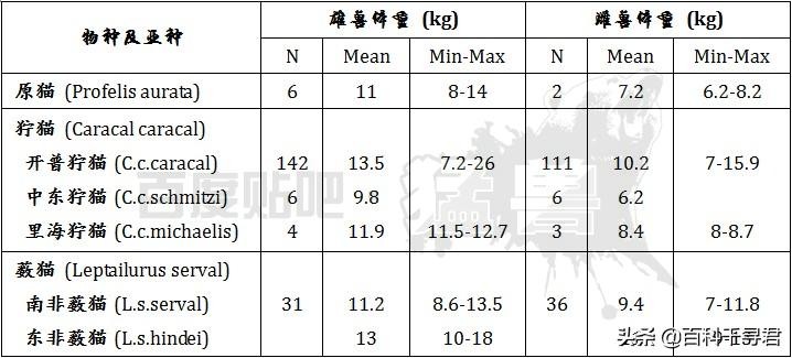 上图是原猫、狞猫和薮猫的体重数据表。