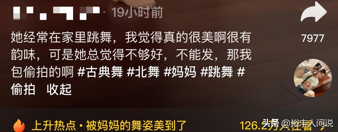 1月27号晚,一则“被妈妈的舞姿美到了”的话题登上热搜。发布这段视频的网友来自美国,留言处,她感慨的说道:她经常在家里跳舞,我觉得真的很美啊,很有韵味,可是她总觉得不够好,不能发,那我包偷拍的啊……