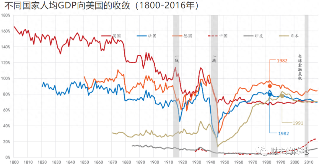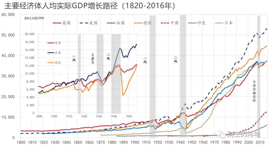 与此对应的是,一些虽然一度崛起,但远没有做到全球领先的大国,如德国、日本和前苏联,它们的人均GDP,哪怕是在崛起时刻,也一直远低于当时的霸主,这或许就注定了,它们在挑战经济霸主时候的悲剧命运。