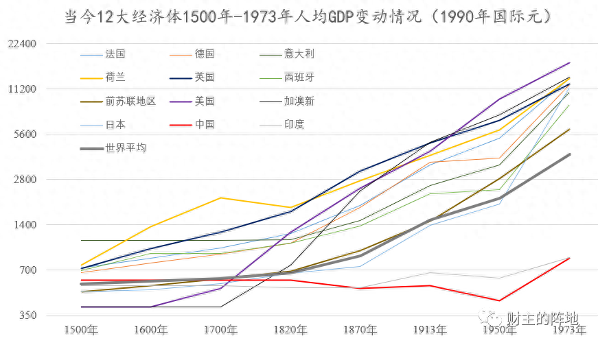 下面这张图,是我个人根据麦迪逊《世界经济2000年》上的数据,针对当今世界12个主要经济体在1500年-1973年人均GDP变化所做的图表。