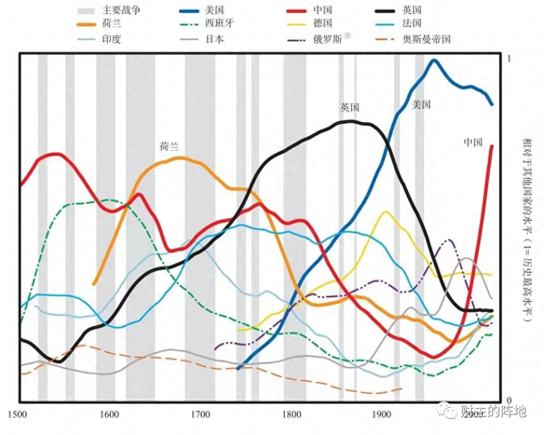 500年来世界主要经济体相对实力地位的粗略估计(最大值为1)。