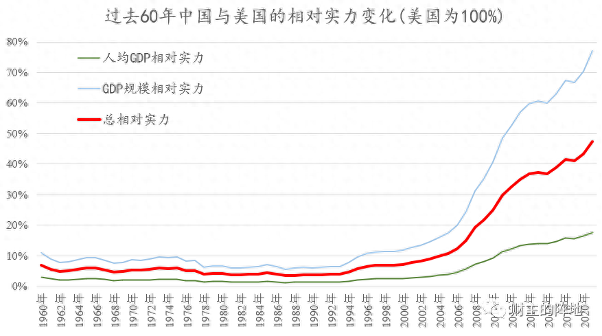 2021年年末,中国的总实力,大约相当于美国的47%。