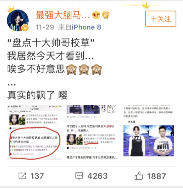 在马艺妮参加过《最强大脑》后就膨胀了起来,网友们称她和她的男友宋思睿是最美“校花校草”,她也曾经发微博表示:“唉,多不好意思……真实的飘了,嘤”。甚至马艺妮在参加过《最强大脑》后还做起了网红,还曾经发表过美妆视频,看过的网友们表示她还是适合做实力派,网红这种身份不适合她。