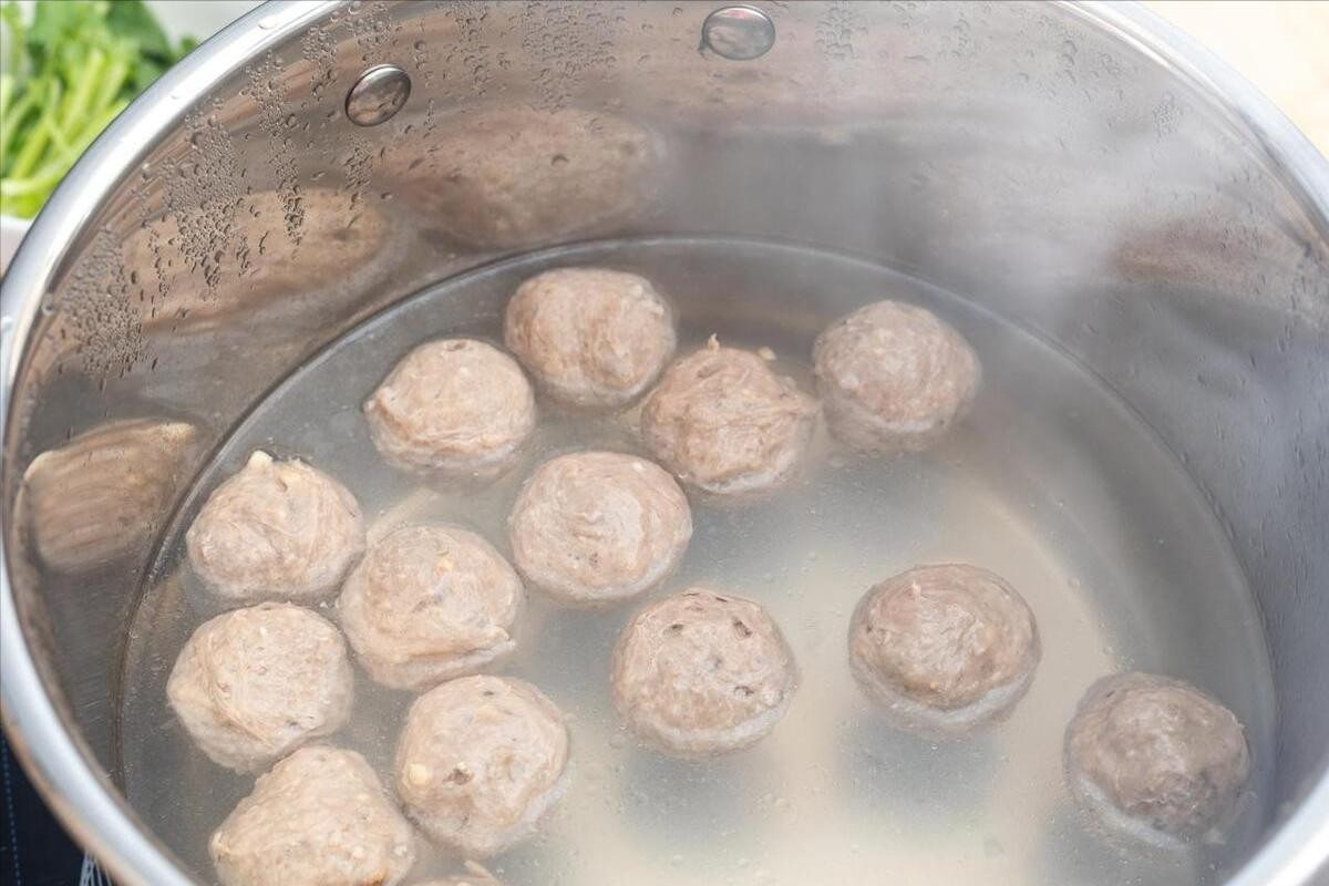 5、把牛肉馅挤在虎口处,团成一个个的丸子,然后用勺子舀出来,放在锅子里,把所有的牛肉丸都处理好之后,开大火开始煮丸子,直至煮到丸子全部飘起来,就可以捞出来了,吃不完的放冰箱冷冻,随吃随取特方便,味道鲜香Q弹。