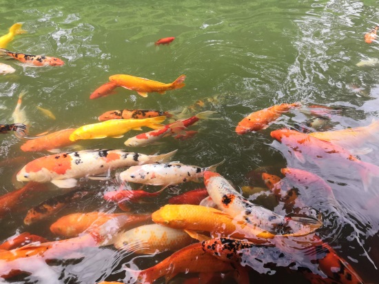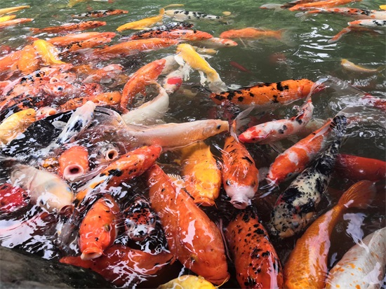 特色喂锦鲤,有卖鱼饲料。可以体验喂鱼活动,不过这些鱼抢饲料太凶猛了。下面几张图随意感受下。估计是工作人员好久都没喂鱼了。