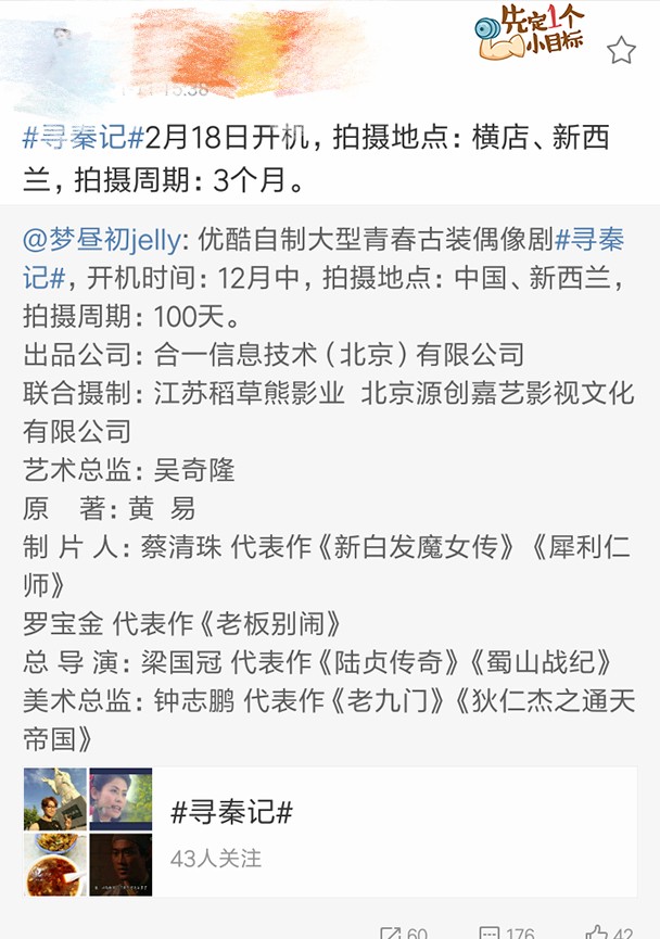 新版电视剧《寻秦记》是优酷自制重点大剧,原计划于2016年12月中开机,但日前传出将于2017年2月18日开机,并将于3个月完成拍摄。