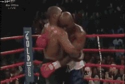泰森非常生气,可是霍利菲尔德巧妙地运用了他的战术,避免了泰森的正面进攻。