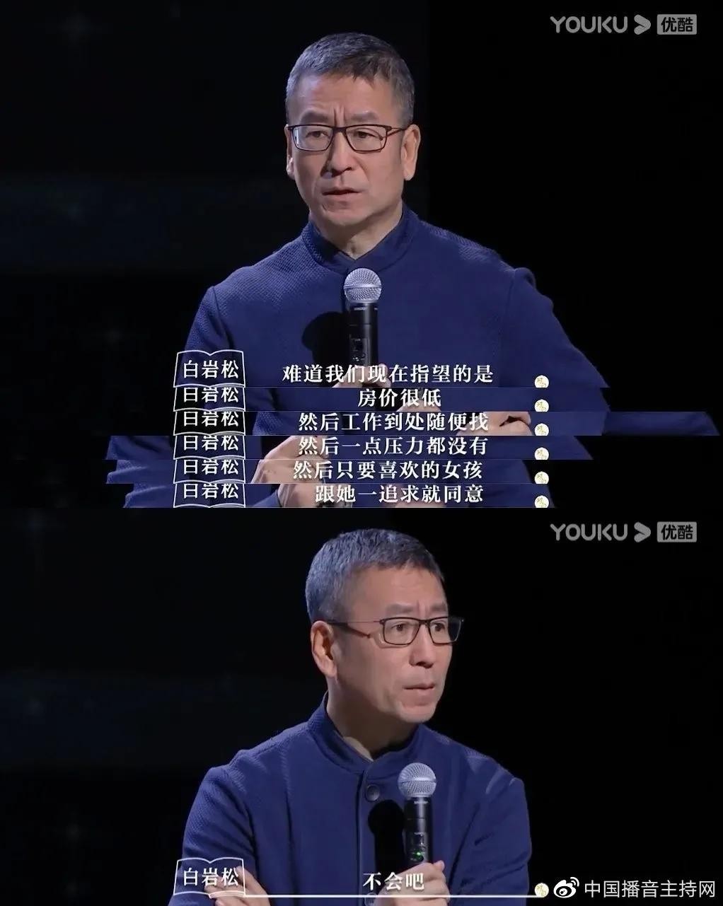 接着后来白岩松先生又被扒出来一段对年轻人的评价“难道我们现在指望的是房价很低,然后工作到处随便找,然后压力一点都没有,然后只要喜欢的女孩,跟她一追求就OK,不会吧?”